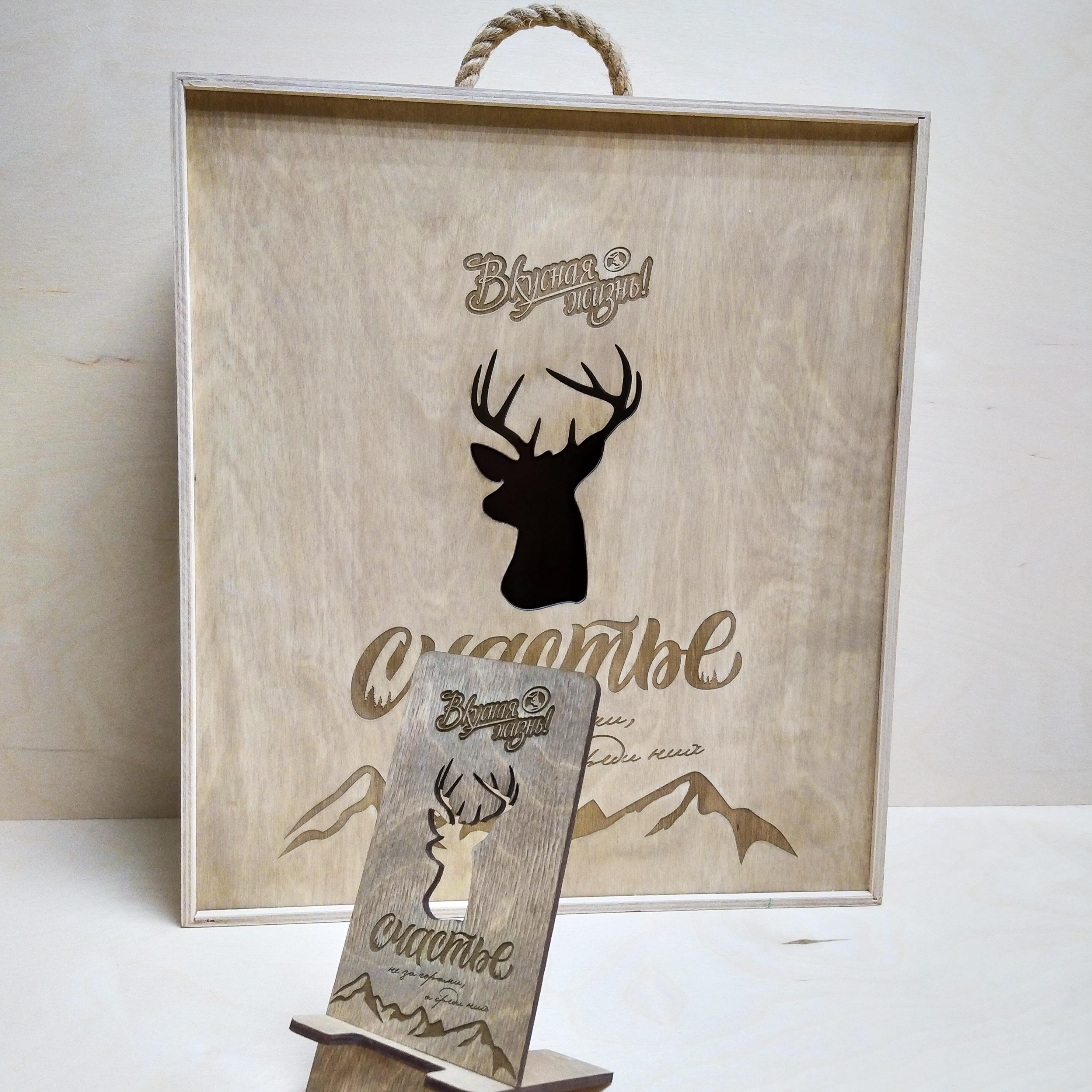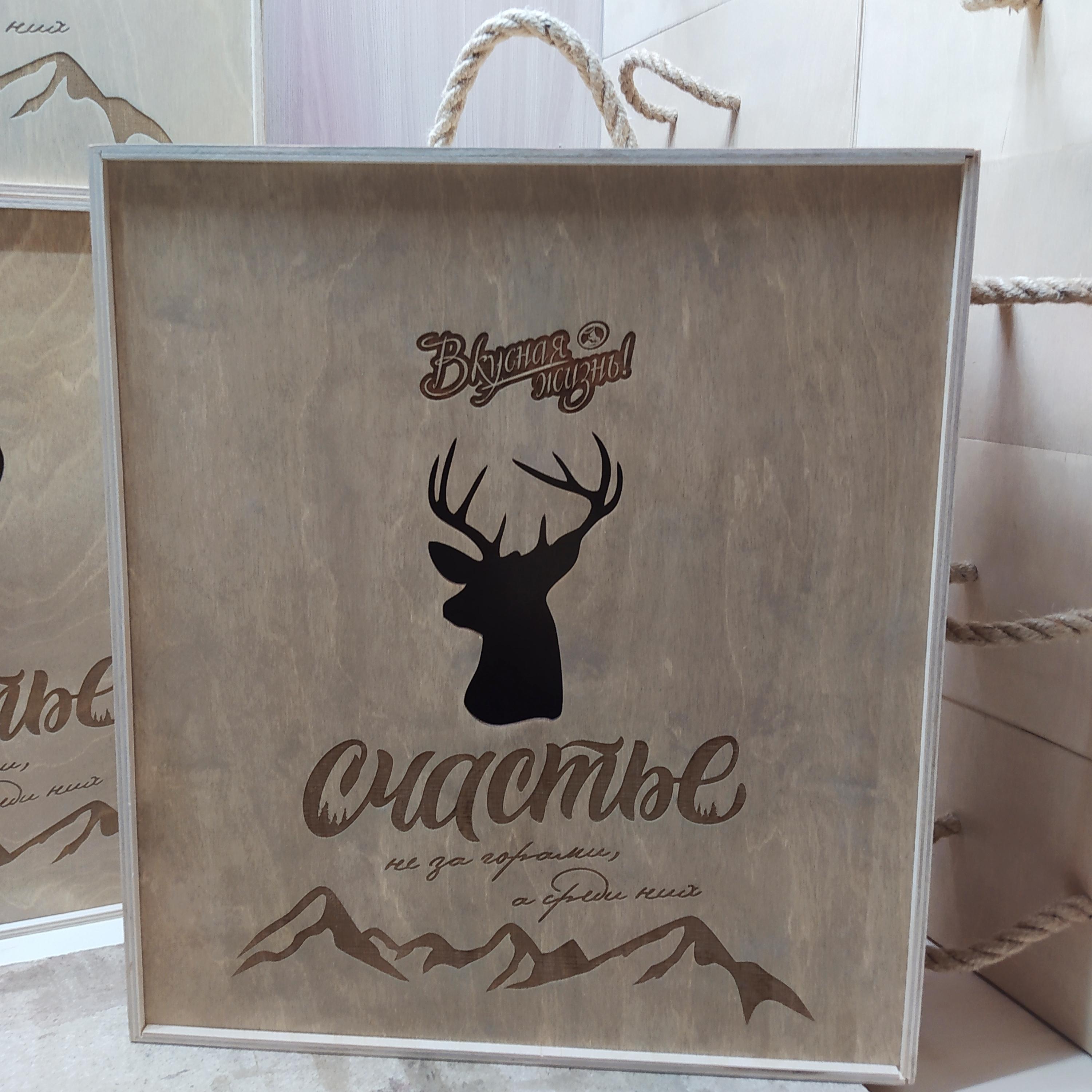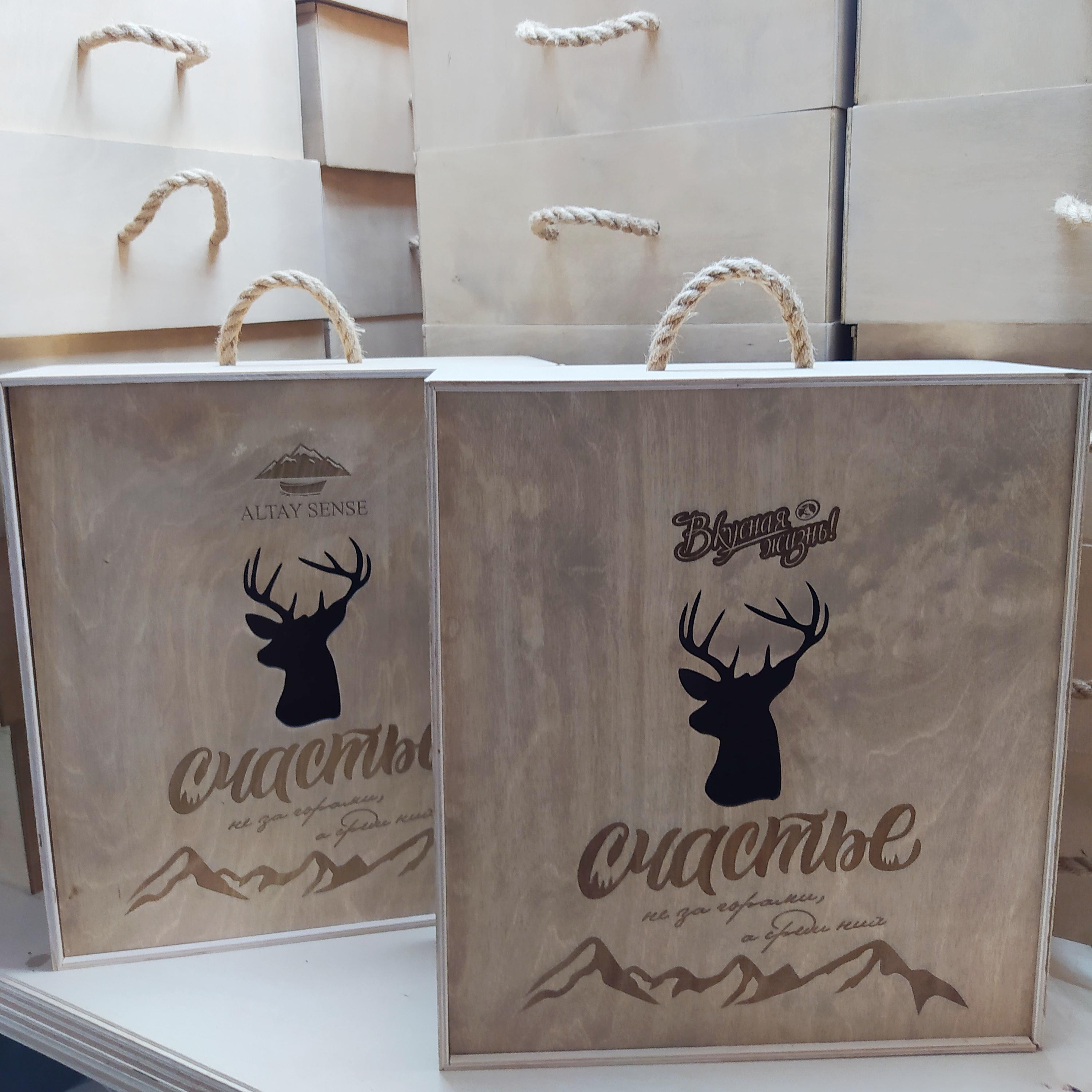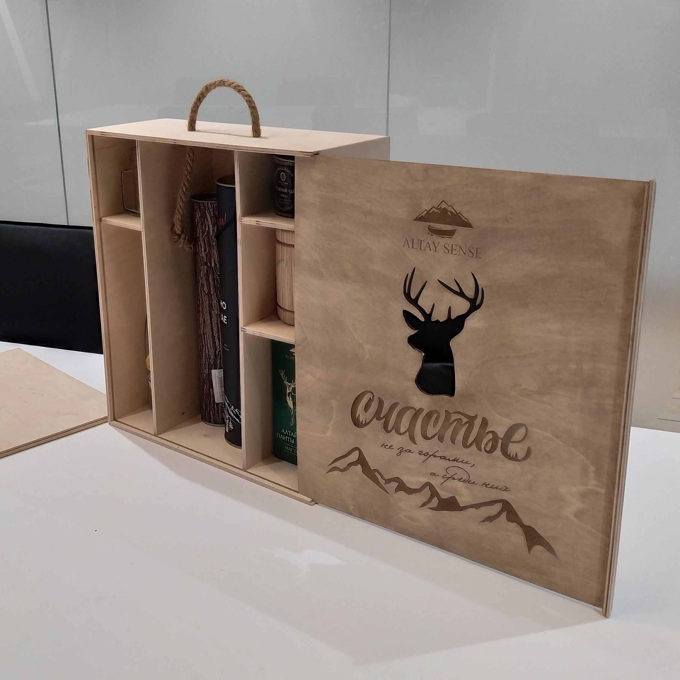 Большая подарочная коробка с перегородками и джутовой ручкой в цвете дуб. Коробка выполнена из фанеры 6 мм Внутри изготовлены перегородки, которые образую несколько отсеков разных размеров Комбинированная крышка (гравировка + резка) изготовлена из фанеры 3 мм. Открывание - вправо, при помощи интегрированной изящной тонкой ручки. Для удобства переноски предусмотрена ручка из джутового каната.