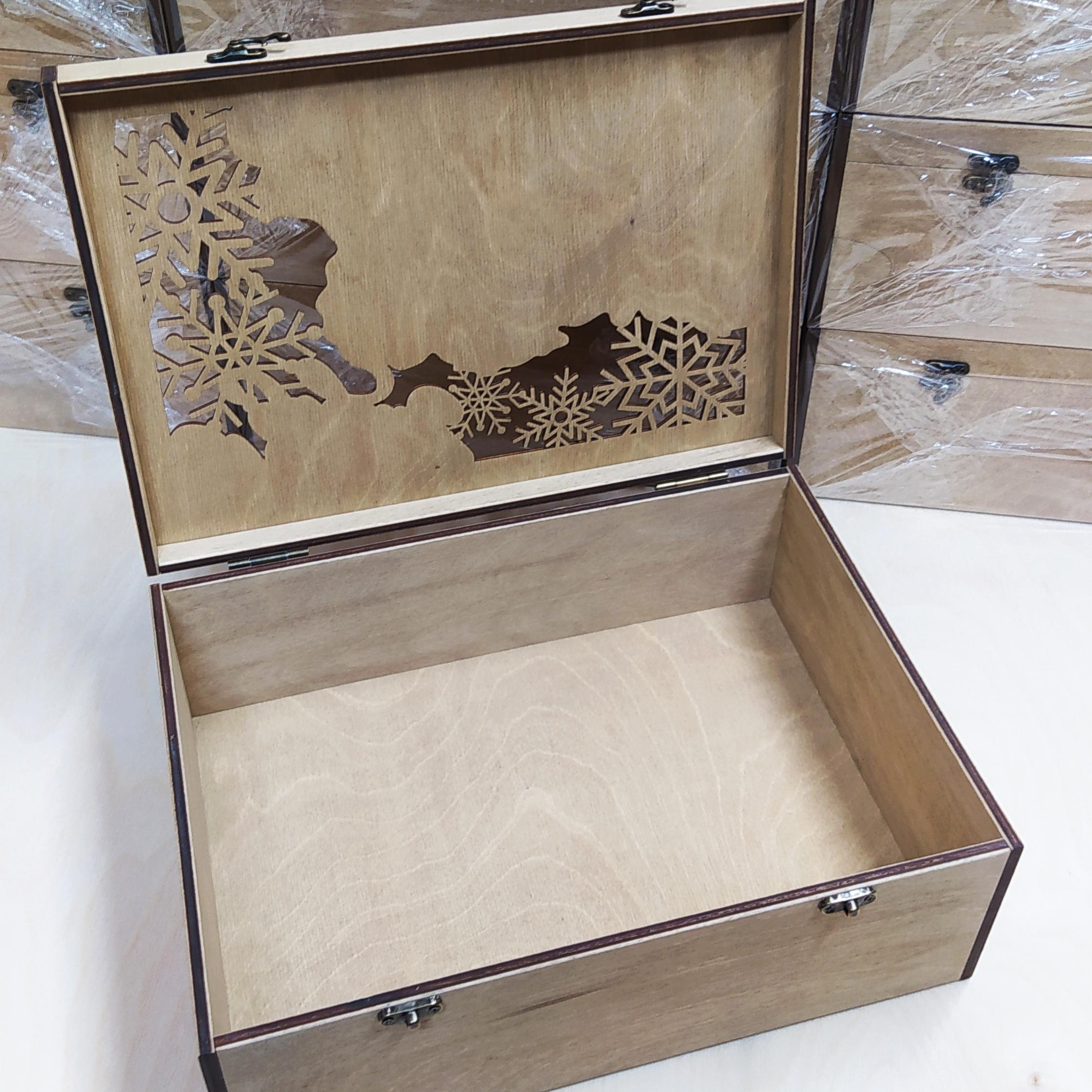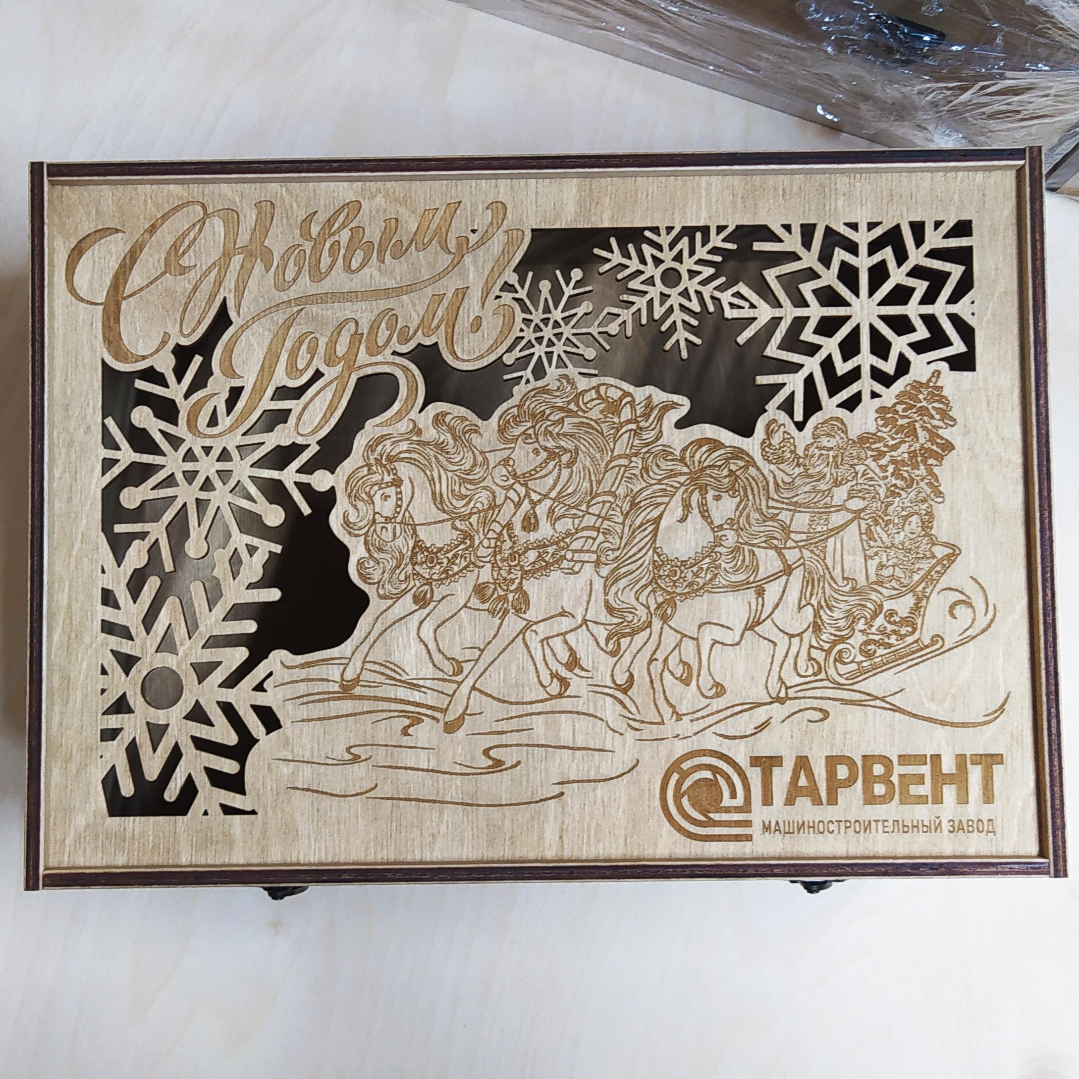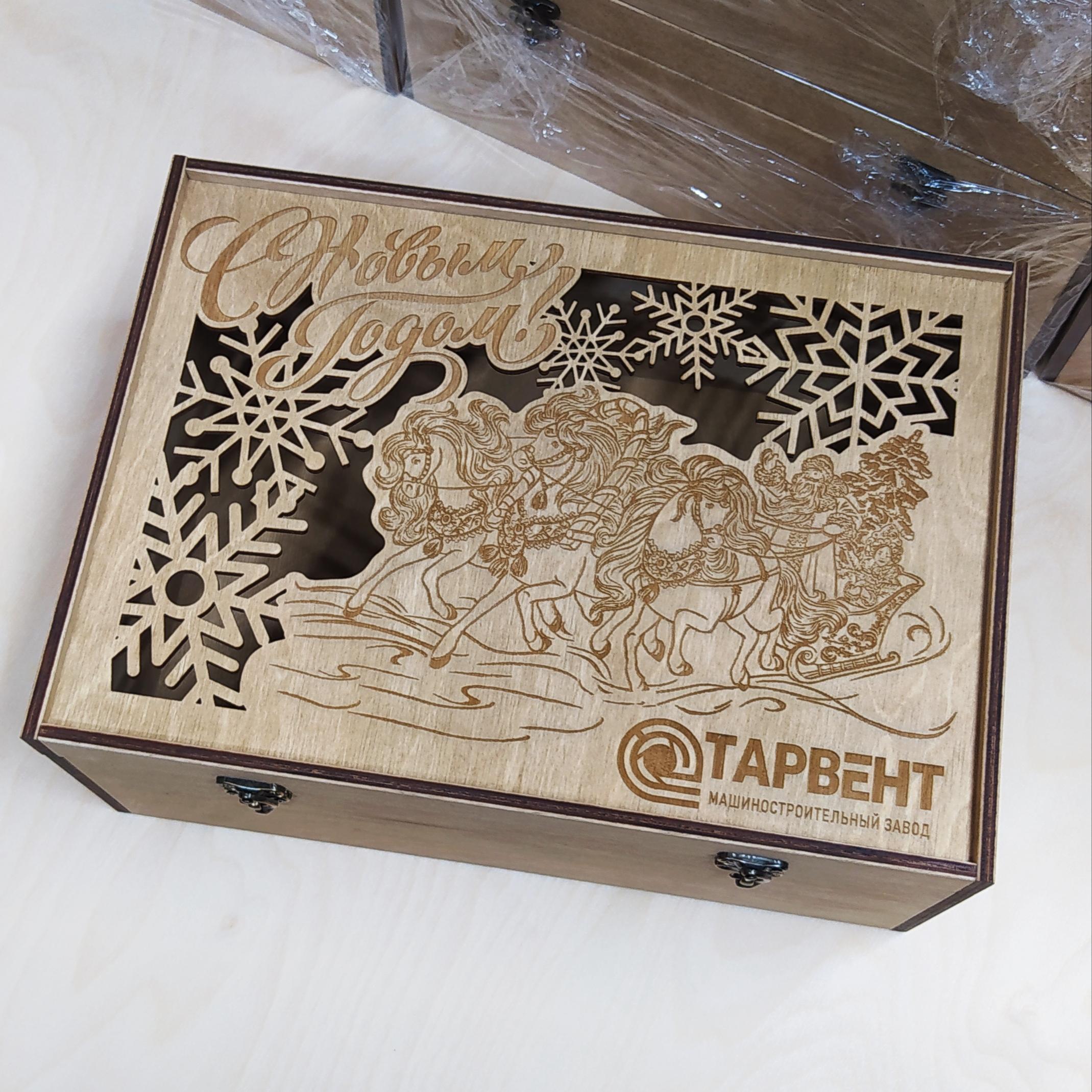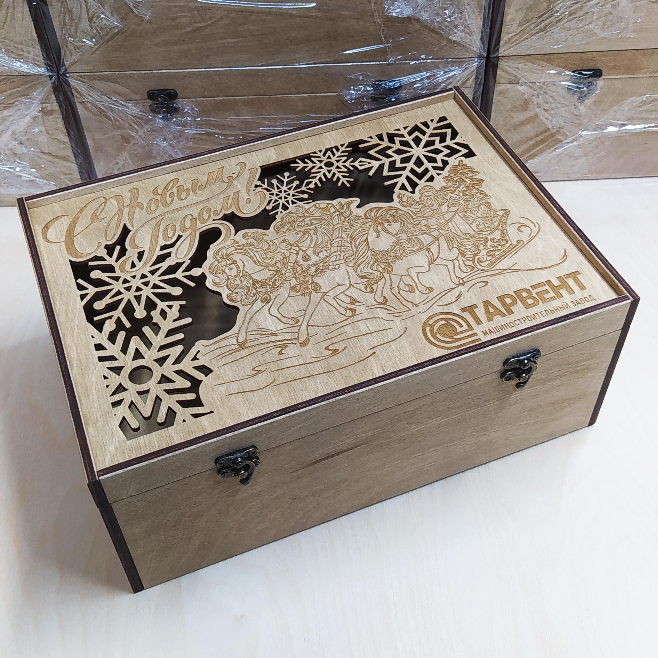 Подарочная коробка с гравировкой и резной крышкой на металлических петлях с замочками. Стенки из фанеры 6 мм Окрашивание - цвет дуб Металлические петли и замки в бронзовом цвете Резная крышка + гравировка рисунка и логотипа компании.
